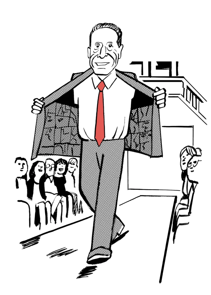 The show itself was a thumpingly loud affair marked by cheering. Councilwoman Stevens fluttered and snapped a folding fan. Cuomo repeatedly flashed the shiny lining of his jacket, which was printed with images of Marilyn Monroe and Joe DiMaggio; backstage, he said of the Queens borough president Donovan Richards’s ensemble, “Queens get the money!” Assemblyman Gibbs brought the swagger, even if his kelly-green suit was giving Mayor McCheese. And Paterson, looking punkish in denim streetwear, shocked the room by launching into a half handstand mid-runway. “I was going to do a front flip, but when I put my hands down they slipped,” he said.